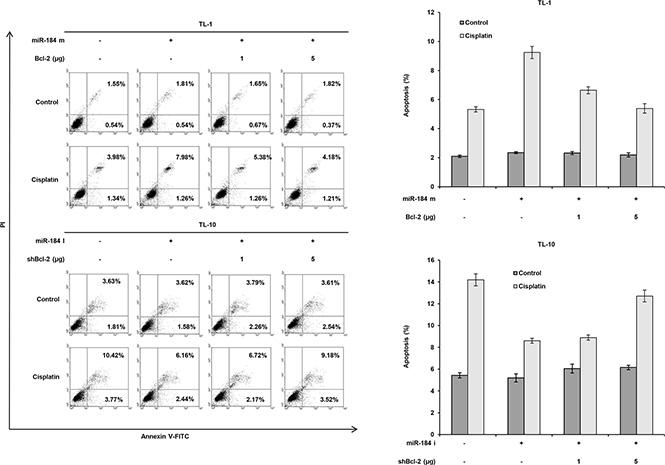 Figure 6: Increase in Bcl-2 expression by reduced miR-184 may be responsible for cisplatin resistance via apoptotic pathway. TL-1 cells were treated with miR-184 mimic (m, 40 nM) and/or Bcl-2 expression vectors. TL-10 cells were treated with miR- 184 inhibitor (miR-184i, 40 nM) and/or shBcl-2 for 24 h. Indicated cells were treated with 0.1% DMSO or 5 μM cisplatin for 24 h. The cells were subjected to annexin V and PI staining by a flow cytometry analysis. Percentage of apoptotic cells including with the Annexin V+/PI- population (early apoptosis) plus Annexin V+/PI– (late apoptosis/secondary necrosis) was summarized by a flow cytometric analysis. Data are expressed as means ± s.d. (n = 3).