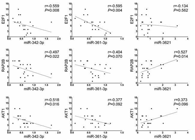 Figure 6: Spearman’s rho correlation between the miRNA and downstream target protein expression levels. The expression level of miR-342-3p shows a negative correlation with the protein levels of E2F1, RAP2B, and AKT1. The expression level of miR-361-3p is negatively correlated with E2F1 expression and miR-3621 is positively correlated with RAP2B expression.