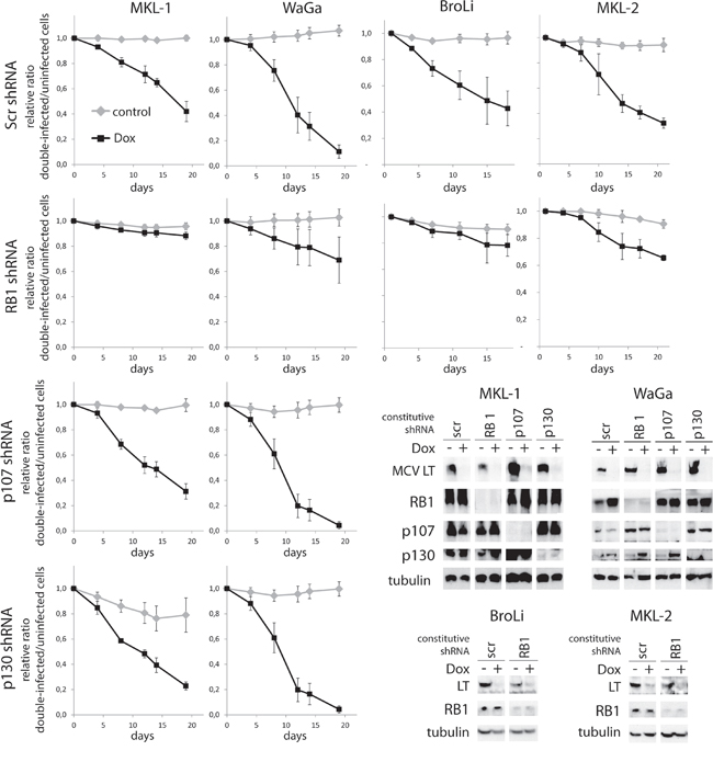 Figure 2: MCPyV-LT knockdown induced growth inhibition can be rescued by RB1 knockdown. MCPyV positive cell lines MKL-1, WaGa, BroLi and MKL-2 transduced with a Dox-inducible TA.shRNA.tet vector system were infected with lentiviral shRNA constructs targeting RB1 (all cell lines), p107 or p130 (MKL-1 and WaGa). A Scr shRNA served as control. Pure populations infected with the PP shRNA constructs were established by antibiotic selection. Following 5 days of Dox treatment total cell lysates were harvested and analyzed by immunoblot for expression of MCPyV-LT and the different PPs. To evaluate changes in cellular growth, mixed populations of double-shRNA-infected cells characterized by green fluorescent expression and parental cells were cultured in presence or absence of Dox and changes of ratios were measured over time by flow cytometry. Mean values (+/- SD) of at least 3 independent experiments are depicted.