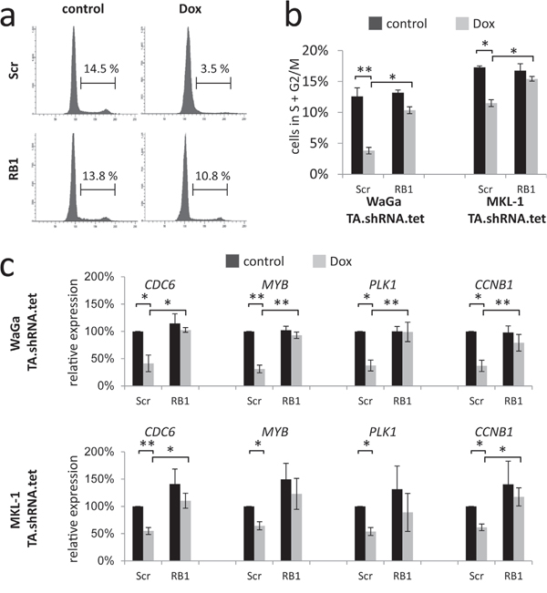 To further evaluate these findings, and to exclude the possibility that paracrine effects distort proliferation measurements in the mixed culture assay [23], cell cycle analyses were performed in MKL-1 and WaGa cells following TA and RB1 knockdown. In accordance with the results of the mixed culture assay, TA shRNA-induced reduction of cells in S and G2/M phase could significantly be reversed by additional knockdown of RB1 (Figure 3a and 3b). Moreover, quantitative RT-PCR experiments revealed that TA shRNA-induced cell cycle arrest was associated with reduced expression of cell cycle related RB1 target genes CCNB1, MYB, PLK1 and CDC6 while upon additional knockdown of RB1 expression levels were hardly affected (Figure 3c).
