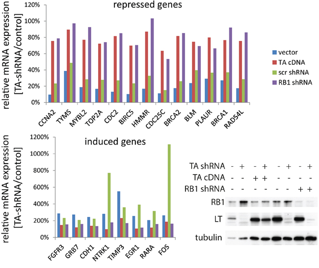 Figure 4: Overlap of genes regulated by MCPyV-TA and RB1 in MCC cells. TA-shRNA was expressed in WaGa cells stably transduced with either empty vector, vector coding for MCPyV-TA, a Scr-shRNA vector or an RB1-shRNA construct. After 5 days LT and RB1 protein levels were analyzed by immunoblot, and mRNA expression levels of 245 cancer related genes were analyzed using the NanoString nCounter™ gene expression system [24]. 90 genes were excluded from further analysis due to very low expression. The absolute expression values of the remaining 155 genes were normalized to the mean value of the 6 house keeping genes. Depicted are the relative mRNA expression levels, i.e. TA-shRNA expressing cells relative to their controls, of the 21 genes displaying a more than two fold change in the empty vector and the Scr-shRNA cells.