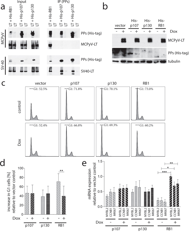 A lack of co-immunoprecipitation cannot formally proof the absence of interaction between two proteins. We thus analyzed next whether MCPyV-LT is able to functionally interfere with the PPs. To address this question in a model system that allows unequivocal distinction of the different PPs, we utilized mouse embryonic fibroblasts derived from animals in which all three PP genes have been knocked out (MEF-TKO) [29] engineered for Dox-inducible expression of MCPyV-LT278 (Figure 5b). Ectopic expression of p107, p130 or RB1 in these cells (Figure 5b and Supplementary Figure S1) led to a partial cell cycle arrest (Figure 5c and 5d) as well as to reduced expression of the E2F target genes MYBL2, CCNB1 and MKI67 (Figure 5e). Upon induction of MCPyV-LT RB1-induced cell cycle arrest and gene repression were significantly reversed while MCPyV-LT did not affect the p107- and p130-induced effects (Figure 5c and 5d).