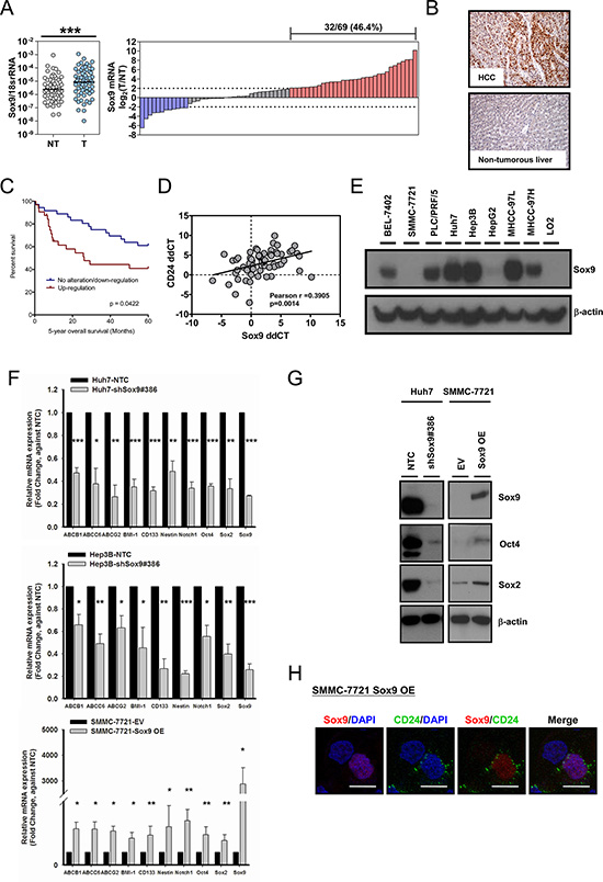 By qPCR we assessed the transcript levels of Sox9 in the tumor tissues and the corresponding non-tumorous liver tissues in 69 human HCC samples. Sox9 was overexpressed in HCC tissues compared to the non-tumorous counterpart (p < 0.001). Sox9 upregulation (tumor/non-tumor ≥ 4) was observed in 32 cases (46.4%) (Figure 1A). Sox9 overexpression was also demonstrated at protein level by immunohistochemistry (IHC). Positive staining was detected in HCC cells while the hepatocytes in the non-tumorous tissue showed no staining (Figure 1B). A significant correlation between Sox9 mRNA and protein overexpression was observed (p = 0.0008) (Supplementary Table S1). The expression data in the clinical cohort were subjected to statistical correlation with various clinicopathological parameters in our database. Upregulation of Sox9 (by qPCR) in HCC was associated with poorer tumor cell differentiation (p = 0.003), venous invasion (p = 0.026), higher tumor stage (p = 0.044) and shorter overall survival (Table 1 and Figure 1C). Furthermore, Sox9 transcript level in HCC tissues is positively correlated with that of CD24, our previously characterized liver T-IC marker [17] (Figure 1D). We also examined the immunohistochemical expression of stemness markers CK19, AFP and EpCAM in the clinical cohort. Seventeen cases (of 67 examined) showed positive CK19 staining. The percentage of positivity is similar to that reported previously [19]. Interestingly, all CK19+ cases were Sox9+, and 14 of the 17 CK19+ cases were demonstrating high Sox9 immunoexpression. In addition, among the Sox9+ subset, majority of AFP+ and EpCAM+ cases (18/22 and 17/22 for AFP and EpCAM respectively) was associated with a high Sox9 immunoexpression (Supplementary Figure S1 and Supplementary Table S2). By Western blotting in a panel of HCC cell lines, Sox9 was abundantly expressed in BEL-7402, PLC/PRF/5, Huh7, Hep3B, MHCC- 97L and MHCC-97H cell lines, while the immortalized normal liver cell line LO2 showed no Sox9 expression (Figure 1E).