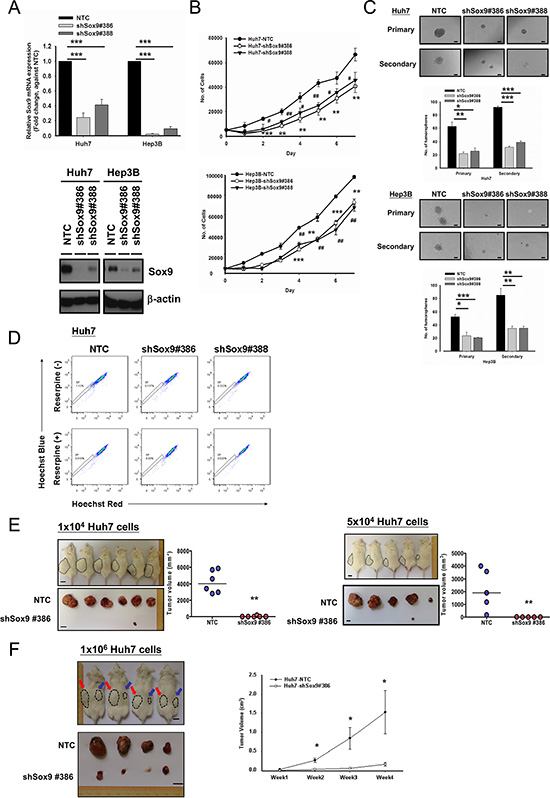 Figure 2: Silencing of Sox9 inhibits cell proliferation, tumorsphere formation and in vivo tumorigenicity in HCC. (A) Two Sox9 stable-knockdown clones (#386 and #388) were established in Huh7 and Hep3B using lentiviral-based shRNA approach. Both Sox9 mRNA (n = 3, ***p < 0.001, t test) and protein levels were suppressed. (B) Knockdown of Sox9 inhibited cell proliferation in both Huh7 and Hep3B cells, when compared with NTC (n = 3, # p < 0.05, **/## p < 0.01 & ***p < 0.001, t test). (C) Knockdown of Sox9 reduced the number and size of the primary and secondary tumorspheres comparing with non-target control (NTC) in both Huh7 and Hep3B cell lines at Day 10 and Day 15, respectively (n = 3, *p < 0.05, **p < 0.01 & ***p < 0.001, t test; Scale bar: 50 μm). The data were presented as mean ± SD. (D) Knockdown of Sox9 suppressed the side population (SP, shSox9#386: 0.137% & shSox9#388: 0.322%) when compared with non-target control (NTC) (1.12%) using Hoechst 33342 labeling. Reserpine sensitivity (lower panel) was used to verify the SPs and to determine optimal staining conditions. (E) Silencing of Sox9 suppressed tumorigenicity in vivo in limited dilution manner of 1 × 104 and 5 × 104 Huh7 cells. Knockdown of Sox9 decreased tumor volume compared with non-target control (NTC) group (Black dotted circle: NTC; **p < 0.01, Mann-Whitney’s U test; Scale bar: 1 cm). Suppression of Sox9 showed a decrease in tumor incidence with both cell numbers injected. (F) Huh7 NTC and Huh7 shSox9 cells were injected subcutaneously into NOD/SCID mice (4 mice per group, 1 × 106 cells injected per mouse). Mice were sacrificed at week 4. Knockdown of Sox9 significantly suppressed HCC tumor growth and volume comparing with non-target control (NTC) group (Red arrow: NTC; Blue arrow: shSox9#386; *p < 0.05; Scale bar: 1 cm). The data were presented as mean ± SD.