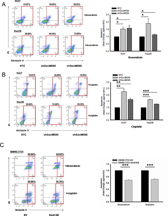 Figure 3: Sox9 confers chemoresistance in HCC. Cells with stably knockdown of Sox9 were more chemosensitive to both (A) doxorubicin at 0.5 μg/mL for Huh7 and 1.5 μg/mL for Hep3B (n = 3, *p < 0.05, t test), and (B) cisplatin at 5 μg/mL for Huh7 and 10 μg/mL for Hep3B when compared with non-target control (NTC) group after 24-hour treatment at serum free condition (n = 3, **p < 0.01 & ***p < 0.001, t test). Representative Annexin V-PI flow analysis plots of each treatment were shown. (C) Sox9-overexpressing SMMC-7721 cells were more chemoresistant to both doxorubicin at 1 μg/mL and cisplatin 5 μg/mL when compared with empty vector (EV) group (n = 3, ***p < 0.001, t test). Representative Annexin V-PI flow analysis plots of each treatment were shown.