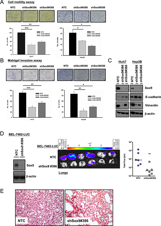 Figure 4: Silencing of Sox9 inhibits cell migration, invasion in vitro and metastasis of HCC in vivo. Knockdown of Sox9 inhibited (A) cell migration ability and (B) invasiveness in both Huh7 and Hep3B cells, when compared with non-target control (NTC) (n = 3, *p < 0.05, **p < 0.01 & ***p < 0.001, t test; Scale bar: 50 μm). (C) Protein expression of E-cadherin was upregulated while vimentin was downregulated upon silencing of Sox9 as demonstrated by Western blotting, signifying inhibition of epithelial-mesenchymal transition with knockdown of Sox9. (D) Sox9 stable-knockdown clone and NTC were established in BEL-7402 luciferase-labeled cells using lentiviral-based shRNA approach. The efficiency of Sox9 silencing was confirmed by Western blotting. Ex vivo xenogen imaging of lungs at 12th week upon injection of either Sox9 silenced or NTC luciferase-labeled BEL-7402 through tail veins of NOD/SCID mice (6 mice per group, 1 × 106 cells injected per mouse). Quantification of luciferase signals showed significant difference between the shSox9 and NTC groups (**p < 0.01, Mann-Whitney’s U test). (E) Hematoxylin and eosin staining of mouse lung tissues from NTC and shSox9#386 groups indicated the suppression of pulmonary metastasis upon silencing of Sox9. Representative images were shown (Magnification: 200×).