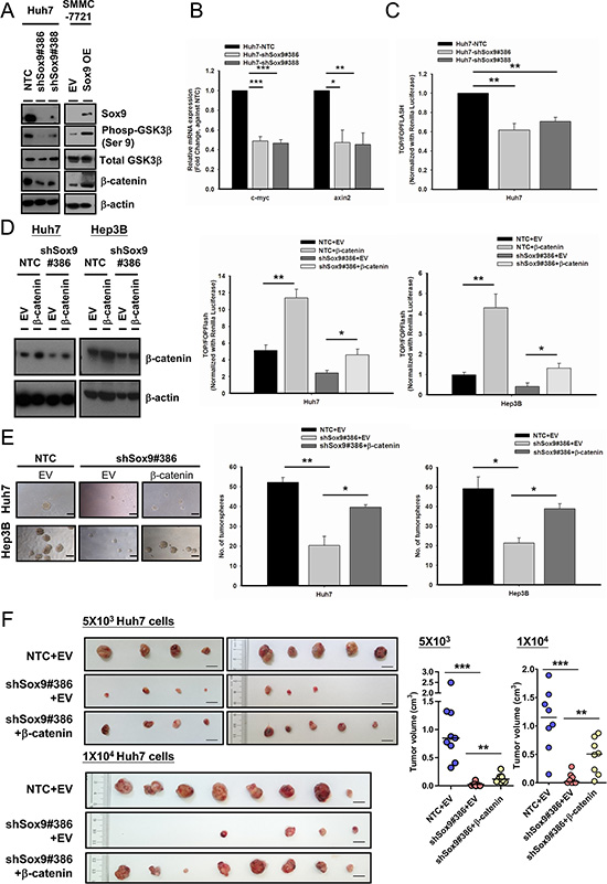 Figure 5: Sox9 enhances stemness features of HCC through Wnt/β-catenin signaling. (A) Silencing of Sox9 downregulated the expression of phosphorylated (Ser9)-GSK3β and total β-catenin in Huh7 using Western blotting. The reversed effects were observed upon Sox9 overexpression in SMMC-7721. (B) Sox9 silencing (Huh7) suppressed the mRNA levels of c-myc and axin2. (n = 3, *p < 0.05, **p < 0.01 & ***p < 0.001, t test). (C) Knockdown of Sox9 suppressed the activation of Wnt/β-catenin signaling cascade in Huh7 using TOP/FOPFLASH luciferase assay (n = 3, **p < 0.01, t test). (D) Stable expression of β-catenin was enforced in shSox9 clone (#386) in Huh7 and Hep3B and validated using Western blotting. The suppression of Wnt/β-catenin signaling activity was partially rescued in shSox9 knockdown cells upon enforcement of β-catenin when compared with empty vector (EV) group (n = 3, *p < 0.05, **p < 0.01, t test). (E) The suppression of tumorsphere formation ability through knockdown of Sox9 was partially rescued upon β-catenin enforcement (n = 3, *p < 0.05, **p < 0.01, t test; Scale bar: 100 μm). The data were presented as mean ± SD. (F) β-catenin or EV-expressing-shSox9 silencing and EV-expressing Huh7-NTC were subcutaneously inoculated in NOD/SCID mice using 5 × 103 and 1 × 104 cells for 70 and 60 days, respectively. Upon β-catenin enforcement, the tumorigenicity of Sox9 silenced cells was partially rescued (n = 9, results from two independent experiments for 5 × 103 group; n = 8 for 1 × 104 group, **p < 0.01 & ***p < 0.001, Mann-Whitney’s U test; Scale bar: 1 cm).