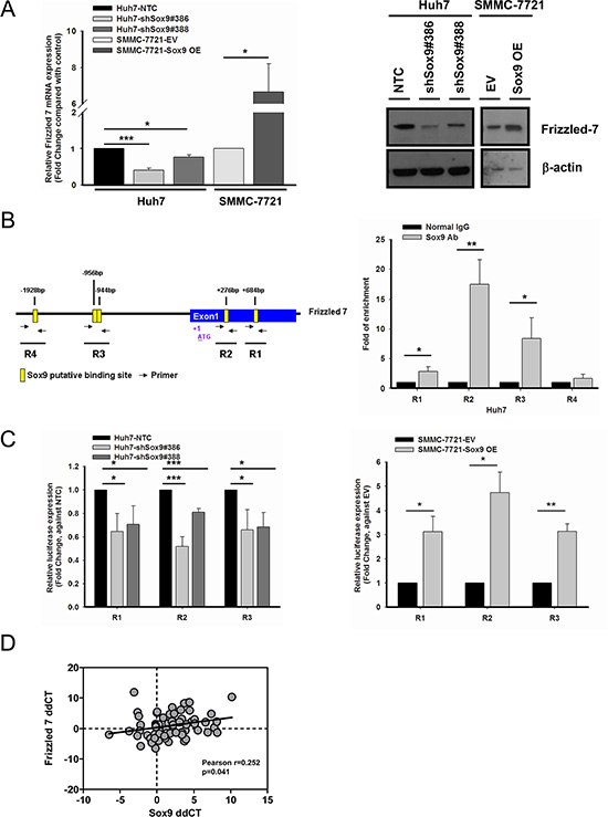 Having consolidated the above findings, we attempted to extend our investigation on identifying the transcriptional target of Sox9 in the canonical Wnt pathway. With reference to the ChIP-sequencing data from a previous study by other groups [25], we examined whether Frizzled-7 (FZD7), a key receptor in Wnt/β-catenin pathway activation, would possibly be a downstream target of Sox9. FZD7 is overexpressed in human HCC [26] and activates the Wnt/β-catenin pathway [27, 28]. We found by qPCR and Western blotting FZD7 expression was suppressed in Sox9 knockdown clones compared with NTC. The reversed results were observed upon transient Sox9 overexpression (Figure 6A). Using the web-based prediction program ConSite for transcription factor binding analysis, several putative Sox9 binding sites were found on FZD7. ChIP assays results showed that Sox9 binds to FZD7 at R1, R2 and R3 regions. Among these three regions, binding at R2 showed the highest fold of enrichment (17.52-fold), while R1 with 2.84-fold and R3 with 8.40-fold when compared with normal rabbit IgG control (Figure 6B). To further confirm the direct binding of Sox9 on these regions, we examined the FZD7 promoter activity in Sox9 expression-altered HCC cells using luciferase reporter assay. Significant decrease of signals was detected in all three regions in Sox9-silenced Huh7. Similar fold change of luciferase signals were detected at R1 (0.65- and 0.71-fold) and R3 (0.66- and 0.69-fold) in both knockdown clones #386 ad #388. The signals were significantly enhanced after Sox9-overexpression in SMMC-7721, with 3.12- and 3.14-fold at R1 and R3, respectively. The binding at R2 was most significantly suppressed by 0.52-fold in shSox9#386, while largely upregulated to 4.73-fold in Sox9-overexpressing SMMC-7721 when compared with the respective control groups, which agreed with our findings in ChIP assay of highest fold of enrichment detected at R2 (Figure 6C). This transcriptional relationship was further supported by a positive correlation of mRNA levels of FZD7 and Sox9 in our clinical HCC cohort (Figure 6D). These findings suggest that Sox9 activates Wnt/β-catenin signaling through transcriptional regulation of FZD7 (followed by phosphorylation of GSK3β and the downstream events).
