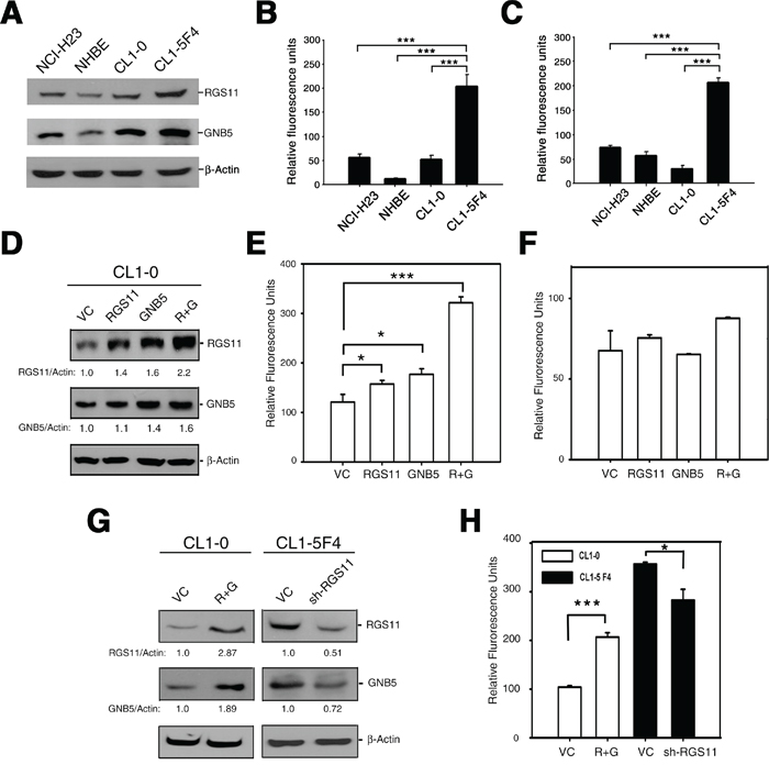 Figure 3: Association of RGS11 expression status with cell migration potency. A. Endogenous level of RGS11 and GNB5. The cell lysates (50 μg/cell line) of NCI-H23, NHBE, CL1-0, and CL1-5F4 cells were resolved by SDS-PAGE, and the bands were immunoblotted with antibody specific to RGS11 or GNB5, as indicated on the right. NHBE cells served as a normal lung cell control, and β-Actin as a protein loading control. B-C. Transwell cell migration and invasion assays. Cells (5 × 105 / reaction) were starved in serum-free medium for 2 h at 37°C, seeded into the upper chamber of the Transwell inserts with 8 μm-pore size polycarbonate membranes uncoated or coated with tumor-associated extracellular matrix and subjected to the migration and invasion assays, respectively. The cells were chemoattracted by medium containing 10% FBS in the bottom chamber at 37°C for 6 h (cell migration) or 24 h (cell invasion). The cells that moved through the membranes were quantified using a fluorometric detection system according to the manufacturer’s instruction. The experiments were performed in triplicate, and the data are expressed as the mean ± SD. *** indicates P < 0.001. D. Exogenous expression of RGS11 and GNB5. CL1-0 cells were transiently transfected with a plasmid encoding for RGS11, GNB5, or the combination of RGS11 and GNB5, as indicated. The expression levels of the corresponding proteins of the transfectants were determined by Western blotting, as described above. The expression levels were normalized to that of β-Actin and are represented as fold increase compared with the control cells (VC), as indicated at the bottom. E-F. Effect of gene manipulation on cell migration and invasion. Cell migration and invasion assays were performed in Transwell chambers, as described above. Data are expressed as the mean ± SD of triplicates. G. Western blot analysis of RGS11 and GNB5 in stable transfectants. CL1-0 cells were cotransfected with plasmids encoding for RGS11 and GNB5 (R+G), and then treated with G418 and hygromycin. CL1-5F4 stable transfectants with knocked-down endogenous RGS11 expression (sh-RGS11) were selected in medium containing puromycin. The levels of RGS11 and GNB5 expression were determined by Western blotting. H. Cell migration of the stable cells. The cell migration capability of the transfectants with overexpressed of RGS11 and GNB5 (R+G) or attenuated expression of RGS11 (sh-RGS11) were determined by the Transwell assay performed as described above. The data were analyzed using Student’s t test. * and *** indicate P < 0.05 and P < 0.001, respectively.