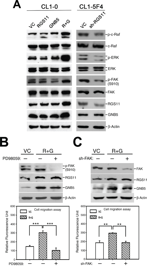 Figure 4: Promotion of cell migration by coupling of RGS11–GNB5 expression with activation of Raf–ERK–FAK signaling. A. Activation of Raf–ERK–FAK signaling. The cell lysates of CL1-0 transfectants that stably expressed RGS11, GNB5, or combination of RGS11 and GNB5 (R+G) as well as the lysates of CL1-5F4 transfectants with the RGS11-specific small hairpin RNA (shRNA) (sh-RGS11) were resolved by 10% SDS-PAGE, blotted onto a nitrocellulose membrane, and probed with antibody specific to p-c-Raf (Ser338), total c-Raf, p-ERK (Thr202/Tyr204), ERK, p-FAK (Ser910), FAK, RGS11 and GNB5. Control cells were transfected with their corresponding vectors (VC). Beta-Actin (β-Actin) serves as a control. B. Inhibition of MAPK/ERK activity. The RGS11–GNB5 transfectants (R+G) were pretreated with 20 μM PD98059 (MAPK/ERK inhibitor) for 2 h or not, as indicated. C. Attenuation of FAK expression. The RGS11–GNB5 and control (VC) transfectants were seeded 24 h before treatment. Subsequently, the R+G transfectants were transiently transfected with the FAK-specific shRNA (sh-FAK) for 48 h or not, as indicated. The cell migration capability was measured in in vitro Transwell assays for 6 h at 37°C. The experiments were performed in triplicate, and the data are expressed as the mean ± SD. ** and *** indicate P < 0.01 and P < 0.001, respectively.