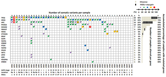 To elucidate which genomic alterations were inherited or acquired, paired tumor and adjacent normal tissue samples were collected from 50 patients with CRC. Table 1 lists the clinical features of all enrolled participants. Sixty percent of CRC patients received a diagnosis at early stage (stages 0–II), and the location of tumors was evenly distributed among the right site, left of the large intestine, and the rectum. All patients received surgery to remove tumor lesions. Only one patient with metastatic cancer received target therapy of anti-EGFR monoclonal antibody cetuximab. For an advanced comparison of germline variants between cancer patients and the general population, PBMC DNA samples were collected from 20 young asymptomatic controls with normal CEA and iFOBT lab data and no self-reported cancer history who were recruited for this study.