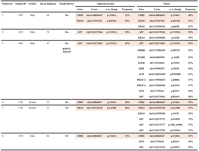 In general, germline mutations exhibit a mutation frequency of approximately 50% in both normal and tumor tissues. Except for germline variants, 5 of the 6 patients acquired at least one additional somatic mutation in their paired tumor tissues. Notably, Sample ID 1736 gained 4 somatic mutations and Sample ID 1461 gained 9 additional somatic mutations in the tumor samples (except for the inherited NRAS G138R and APC V1125A variant, respectively). Apart from these 5 patients, only one patient (Sample ID 1705) developed cancer with only one heterozygous germline CDH1 mutation with the absence of other somatic mutations.