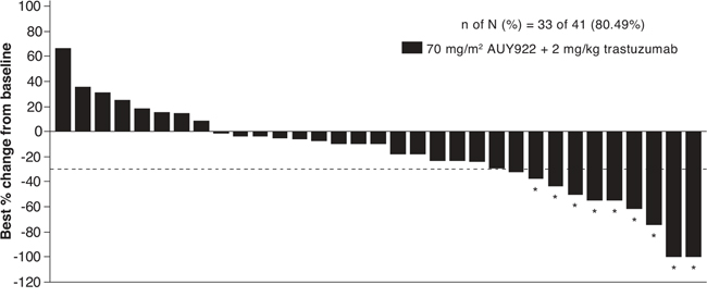 The phase 2 part used a Bayesian design to estimate the ORR observed with this regimen with AUY922 at the identified MTD and/or RP2D. For phase 2 part, given an observed ORR equal to 30%, approximately 40 patients (including those already treated at the RP2D during the phase 1B part) were planned for the model to have less than 10% posterior risk of the true response rate being less than 20%.