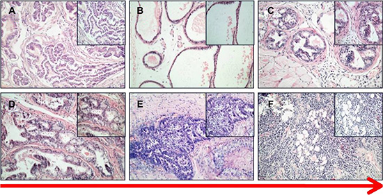 Figure 2: HE staining of PCa in MNU-induced mice. (A) control. (B) prostate acinar hypertrophy. (C, D) PIN and primary cancer. (E, F) invasive cancer (200×, 400×).