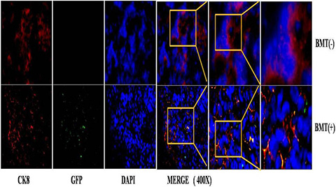 To characterize the BMDCs in PCa, we examined the phenotype of GFP-positive BMDCs in BMT mice by immunofluorescence. The tissues were doubly stained with anti-GFP antibody in addition to either anti-CK8 or anti-SV40-Tag antibodies. Interestingly, a co-expression of GFP and CK8 was observed in the prostate epithelium of BMT-MNU induced mice (14/50 mice) (Figure 5). As the CK8 is a marker that is only expressed in epithelial cells [16], the co-expression of GFP and CK8 indicated that these cancer cells were derived from the bone marrow cell lineage, or otherwise developed by cell-fusion of BMDCs and prostate epithelial cells.