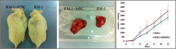 Figure 7: Tumor size and growth curve of RM-1 group and RM-1+BMMSCs group. Asterisk indicates the time points that show a statistically significant difference in tumor volume.