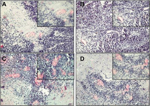 Figure 4: GFP immunohistochemistry staining. (A) negative control. (B) Chimeric mice prostate. (C) Chimeric mice prostate. (D) GFP mice prostate (positive control). Magnification; A, B, D (100×, 200×) C: (200×, 400×).