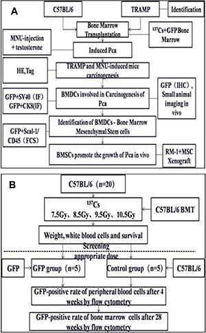 Figure 9: Experimental design (A) Wild type C57 mice and TRAMP mice were subjected to hematopoietic reconstitution from GFP(+) BMDCs. PCa were induced in WT mice by MNU injection. Tumor formation was confirmed by checking HE or IHC staining of resected prostates. GFP-positive BMDCs were assessed by SAI and fluorescence microscopy. BMDCs involved in PCa tumorogenesis were isolated by flow cytometry. To observe the cancer-promoting role of bone marrow mesenchymal stem cells (BMMSCs), RM-1 xenografts with or without BMMSCs were grafted into mice, and then tumor formation was evaluated. (B) the choice of optimal radiation dose for BMT and the process of constructing the BMT model.