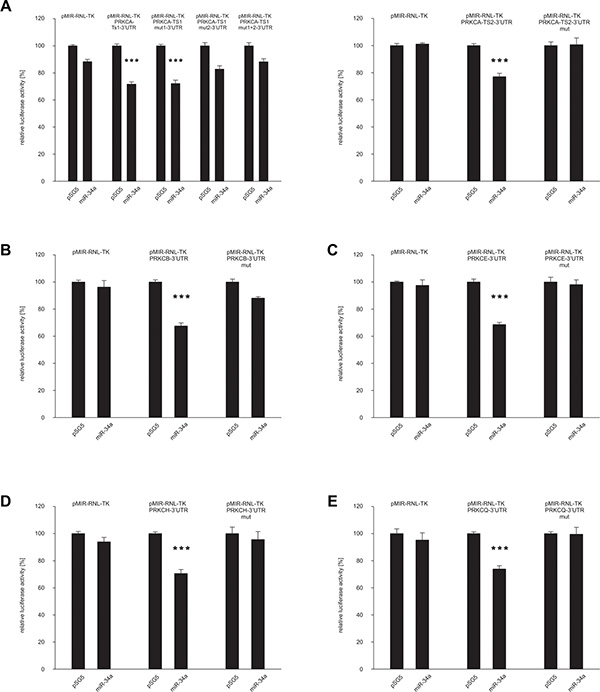 Figure 3: Dual luciferase reporter gene assays of the 3′UTRs of PRKCA, PRKCB, PRKCE, PRKCH and PRKCQ. HEK 293T cells were transfected with empty vectors, reporter gene constructs and miRNA-expression plasmids in the indicated combinations. The luciferase activity of the control vector experiment was set to 100%. The results represent the mean of at least three independent experiments carried out in duplicates. Three asterisks correspond to a P value lower than 0.001. Data are represented as mean +/– SEM. (A) PRKCA-3′UTR, (B) PRKCB-3′UTR, (C) PRKCE-3′UTR, (D) PRKCH-3′UTR and (E) PRKCQ-3′UTR.