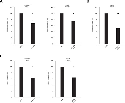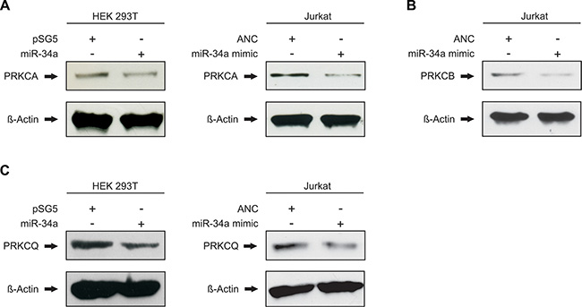 Figure 4: miR-34a-5p regulates the endogenous protein levels of PRKCA, PRKCB and PRKCQ. HEK 293T were transfected either with empty control vector or miR-34a expression plasmid. Jurkat cells were transfected with nontargeting control (allstars negative control) or miR-34a-5p mimic. 48 h after transfection the endogenous protein levels of PRKCA (A), PRKCB (B) and PRKCQ (C) were detected by Western blotting using specific antibodies against PRKCA, PRKCB and PRKCQ. Beta-actin served as loading control.