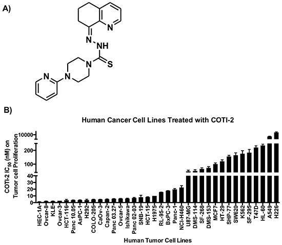 Figure 1: A. COTI-2, a third generation thiosemicarbazone, was designed using the CHEMSAS computational platform. B. Human cancer cell lines were treated with COTI-2. Tumor cell proliferation was examined 72 h after treatment with COTI-2. The IC50 values were calculated from four independent experiments. Error bars indicate SEM.