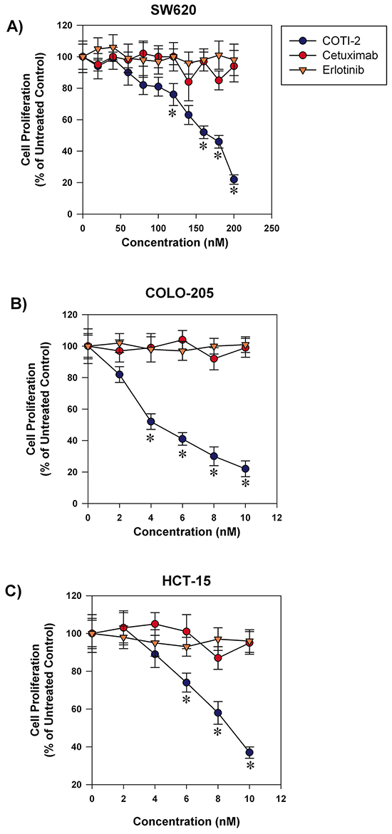 Figure 2: COTI-2 is significantly more effective than cetuximab or erlotinib in inhibiting colorectal cancer cell line proliferation. Human colorectal cancer cell lines A. SW620, B. COLO-205, and C. HCT-15 were treated with varying concentrations of cetuximab, erlotinib, or COTI-2. Tumor cells were allowed to proliferate for 96 h before cell viability was examined using alamarBlue assay. All data points indicate the mean of five independent measures of viability ± SEM. *Significantly different from cells treated with cetuximab or erlotinib using a Student’s t-test (p < 0.05).