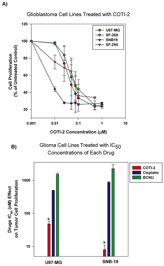 Adjuvant chemotherapy agents are among the most common regimens for the treatment of glioblastoma [13]. However, their effectiveness is limited and often accompanied by high toxicity [14]. Cisplatin and BCNU (carmustine) are often used against glioblastoma but patient response is limited [14]. We tested COTI-2 against multiple human glioblastoma tumors in vitro. As shown in Figure 3A, relatively low concentrations of COTI-2 were active against all human glioblastoma cell lines tested (U87-MG, SNB-19, SF-268, and SF-295). Two of the aforementioned cell lines, (U87-MG and SNB-19) were used to compare the efficacy of COTI-2, cisplatin, and BCNU. As shown in Figure 3B, COTI-2 showed superior activity and low IC50 when compared to cisplatin and BCNU in the treatment of human glioblastoma cell lines. These data collectively show that COTI-2 is more effective than some chemotherapy agents approved for treatment of glioblastoma.