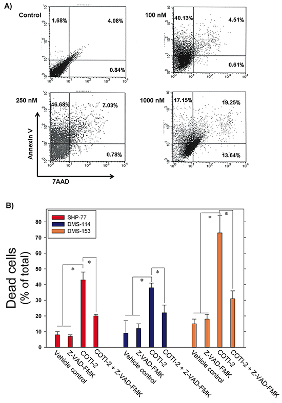 Figure 4: COTI-2 induces apoptosis in human cancer cells. A. SHP-77 SCLC cells were treated with varying concentrations of COTI-2 for 48 h then stained with Annexin V and 7AAD to measure early and late apoptotic events. The lower left quadrant (Annexin V−/7AAD −) represents viable cells, while the upper left (Annexin V +/7AAD −) and upper right (Annexin V +/7AAD +) quadrants show apoptotic and necrotic cells/late apoptotic cells, respectively. B. Human SCLC cell lines (SHP-77, DMS-114, and DMS-153) were treated with the pan-caspase inhibitor Z-VAD-FMK for 1 h before culture media was replaced with fresh medium containing Z-VAD-FMK with or without COTI-2. Cells were cultured for 24 h then examined for apoptosis through Annexin V and PI staining. Cells were analyzed with flow cytometry. Mean values are obtained from three independent experiments ± SEM. *Significantly different from cells treated with vehicle, Z-VAD-FMK, or Z-VAD-FMK + COTI-2 using a Student’s t-test (p < 0.05).