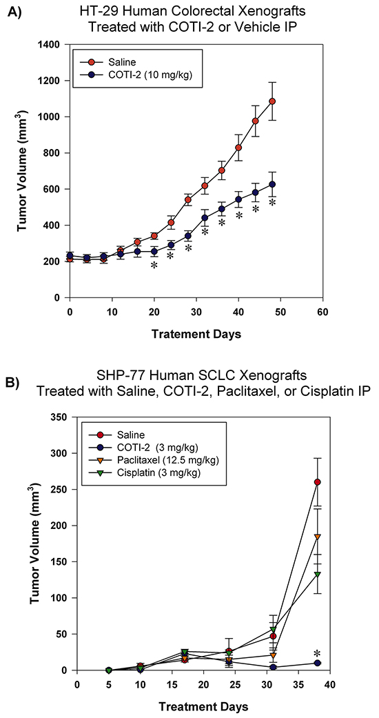 Figure 5: COTI-2 treatment inhibits human HT-29 and SHP-77 xenograft growth. A. HT-29 human colorectal tumor cells (2 X 106) were injected into the flanks of NCr-nu mice (n = 5 mice per group). Xenografts were allowed to reach ~ 200 mm3 before IP treatment initiation with COTI-2 (10 mg/kg, 5 days a week for 7 weeks) or saline alone. Tumor growth was measured every 4 days by caliper measurement. *Significant difference from saline treatment, Student’s t-test, p < 0.05. B. Two million SHP-77 SCLC cells were injected into the flanks of NCr-nu mice (n = 5 mice per group). One day after injection of SHP-77 cells, animals received either 3 mg/kg of COTI-2 (once every two days, up to 38 days), 12.5 mg/kg of paclitaxel in 0.5 ml isotonic saline (once every two days, up to 38 days), or 3 mg/kg of cisplatin in isotonic saline (once per week for four weeks) IP. Tumor sizes were examined with caliper measurements. *Significant difference, Student’s t-test, p < 0.05.