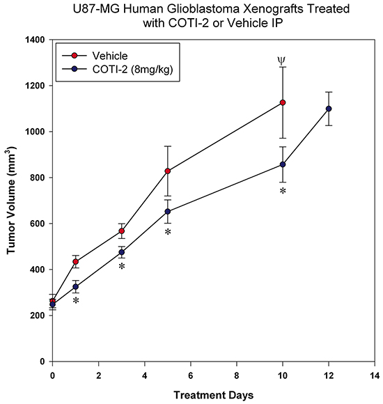 Figure 6: COTI-2 treatment delays U87-MG xenograft growth. U87-MG glioblastoma cells (2 × 106) were injected into the hind legs of the nude mice (7 mice per group). Tumors were allowed to grow to 200-300 mm3 before animals received COTI-2 treatment (8 mg/kg, 3 times per week) IP. *Significant difference, Student’s t-test, p < 0.05. Ψ Indicates the day on which all animals in the control group were euthanized.