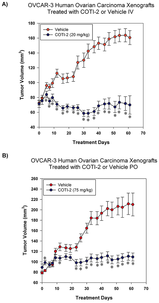 Figure 7: COTI-2 treatment inhibits OVCAR-3 xenograft growth. OVCAR-3 ovarian carcinoma cells (7 × 106) were injected SC over both thighs of NIH III nu/nu mice (n = 10-16 mice per treatment group). Tumors were allowed to grow to approximately 75-100 mm3 before the start of treatment. Mice received control vehicle (phosphate-citrate buffer without COTI-2, pH 3) or COTI-2 either A. IV (20 mg/kg, 3 times per week) or B. PO (75 mg/kg, 5 times per week). *Significant difference from control treatment, Student’s t-test, p < 0.05.