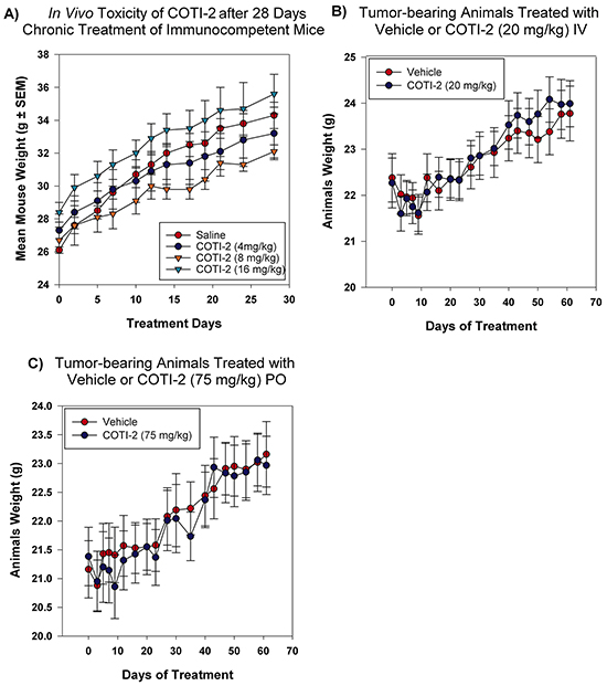 Figure 8: COTI-2 demonstrates a safe toxicity profile in vivo. A. Immunocompetent mice (three per group) were treated with COTI-2 dosed IP in a 28-day chronic study. COTI-2 treatment did not result in mice losing weight or showing any sign of morbidity. B. Mice were transplanted with OVCAR-3 xenografts and tumors were allowed to grow to 100 mm3 before treatment with COTI-2. Animals received either vehicle or COTI-2 treatment IV (20 mg/kg, 3 times per week) or C. PO (75 mg/kg, 5 times per week) for 60 days before all the animals were sacrificed. COTI-2 treatment did not result in mice losing weight or showing any sign of morbidity.