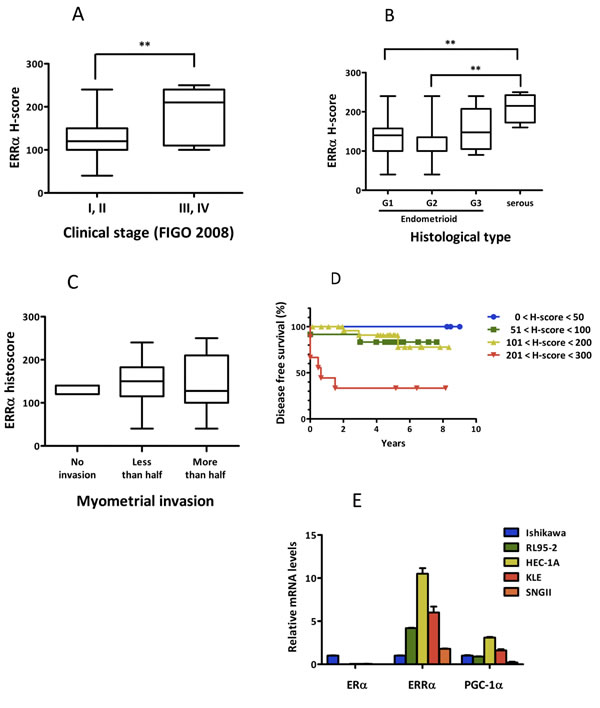 Figure 1: ERRα expression in uterine endometrial cancer in vitro and in vivo. A.-C., Association of ERRα expression with clinico-pathological factors. ERRα expression levels examined by immunohistochemistry were evaluated by H-score and their association with clinical parameters, including clinical stage based on FIGO 2008 classification A., histopathological type B., and myometrial invasion C. are presented. Statistical significance was determined by using the Kruskal-Wallis H-test. The Mann-Whitney U-test with Bonferroni correction was used as a post hoc test. D., Kaplan-Meier analysis of disease free survival in 50 patients with endometrial cancer is shown in association with ERRα expression (P = 0.03). P values were based on log rank test. E., The expression of ERα, ERRα, and PGC-1α, known as a co-activator of ERRα, in endometrial cancer cells was examined by real-time PCR. Significant differences are indicated as ** for P < 0.01 and * for P < 0.05 between groups.