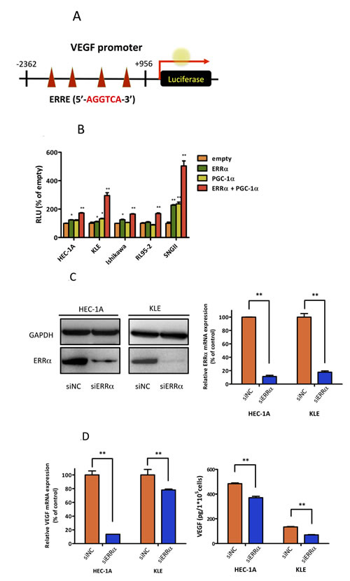 Figure 2: Effect of ERRα knockdown on VEGF expression and angiogenesis. A., VEGF promoter-luciferase reporter containing four copies of the ERRE site, (5′-AGGTCA-3′) was transfected into endometrial cancer cell lines. B., Luciferase transcriptional activity using the VEGF promoter reporter. The pcDNA3.1-ERRα and PGC-1α plasmids were transiently transfected into HEC-1A and KLE cells using Lipofectamine LTX. The pcDNA3.1-empty vector was used as a negative control. After transfection, the cells were incubated for 24 h and then lysed. The promoter activities were assessed by dual 2 2luciferase assay. Data represent means ± SEM (n = 3). C., The effect of ERRα knockdown was evaluated by real-time PCR and western blot analysis. Data represent means ± SEM (n = 3). D., VEGF expression was assessed by real-time PCR and ELISA in HEC-1A and KLE cells transfected with the negative control (siNC) and ERRα (siERRα). After the transfection, the cells were incubated for 48 h and then lysed for real-time PCR and incubated for 72 h for ELISA. Data represent means ± SEM (real-time PCR;n = 3, ELISA; n = 4). E., HUVEC proliferation assay was performed to evaluate the angiogenic potential of cancer cells. HUVECs were cultured with the collected supernatants from endometrial cancer cells transfected with siRNA. After 72 h incubation, the proliferation of HUVECs was measured using the WST-8 assay. Data represent means ± SEM (n = 4). F., Matrigel invasion assay. HUVEC were co-cultured with cancer cells transfected with siRNA in a double-chamber system. After 6 h incubation, migration and invasion of HUVECs were assessed. Cells were counted in three high-power fields (× 200). Data represent means ± SEM (n = 3). Significant differences are indicated as ** for P < 0.01 and * for P < 0.05. Statistical analyses were performed using the two-tailed Student’s t test. Each assay was repeated at least three times. HUVEC, human umbilical vein endothelial cell; RLU, relative luciferase unit.