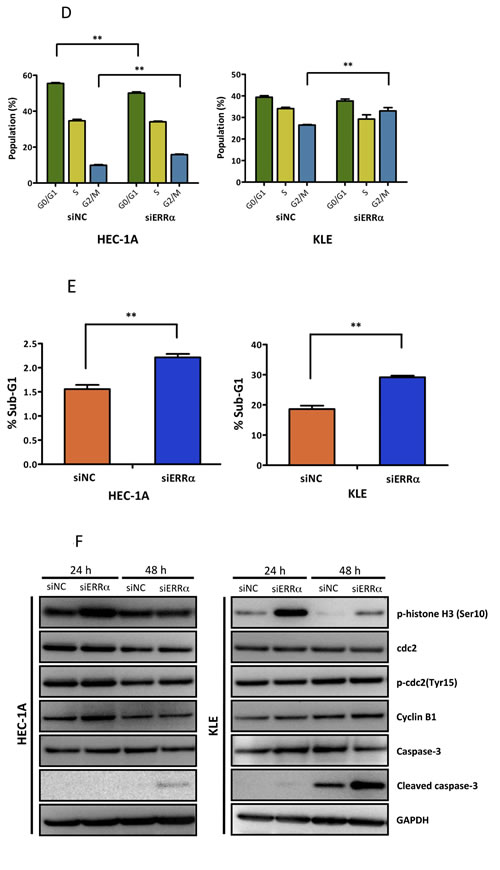 To examine the effect of silencing ERRα on cell proliferation in uterine endometrial cancer cells, we performed the WST-8 assay. Silencing ERRα significantly inhibited the proliferation of HEC-1A and KLE cells (Figure 3A). Additionally, to investigate the effect of ERRα knockdown on colony formation, we performed colony formation assays. Silencing ERRα significantly reduced HEC-1A colony formation (Figure 3B). Flow cytometry analysis was performed to determine how ERRα knockdown suppressed HEC-1A and KLE cell growth. Silencing ERRα caused the accumulation of cells in the G2/M- (Figure 3C, 3D) and sub-G1-phase (Figure 3C, 3E). To further investigate the G2/M-phase arrest, we performed western blotting analysis. Silencing ERRα resulted in a significant increase of histone H3 Ser-10 (HH3-Ser10) phosphorylation, a representative marker of the mitotic phase, whereas the level of CDC2 and cyclin B1, involved in the G2/M checkpoint, did not change significantly over the same time. This result suggested that the accumulation of cells in the G2/M-phase was responsible for the mitotic arrest (Figure 3F). Additionally, our western blotting analysis showed that silencing ERRα increased the expression of cleaved caspase-3, indicating the initiation of apoptosis. Time course experiment using flow cytometry analysis was performed to clarify the relationship between cell cycle arrest and apoptosis. The accumulation of cells at the G2/M phase was detected 24 h after siRNA transfection in both HEC-1A and KLE cells followed by the recruitment of Sub-G1 cells 36-60 h after the transfection. Our western blot analysis also showed that the increase in HH3-Ser10 phosphorylation was confirmed 24 h after transfection in both cell lines, while the increase of cleaved caspase-3 was detected 48 h after transfection (Figure 3F, 3G), which was consistent with the results obtained by flow cytometry. These results suggest that ERRα loss of function induced cell cycle arrest at the mitotic phase in endometrial cancer cells followed by their apoptosis.