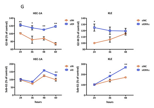 Figure 3: Effect of ERRα knockdown on the proliferation of endometrial cancer cells. A., WST-8 cell proliferation assay. After siRNA transfection, the viability of cancer cells was determined every 24 h. Data represent means ± SEM (n = 4). B., Colony formation assay. Twenty-four hours after siRNA transfection, cancer cells were reseeded at a density of 3 3200 cells/well in 6-well plates and cultured for 14 days. Cells were then stained with crystal violet. C., Cell cycle analysis using flow cytometry. Twenty-four to 60 h after siRNA transfection, cancer cells were collected and flow cytometry analysis was performed. D., Cell distribution in each phase of the cell cycle. Data represent means ± SEM (n = 3). E., Sub-G1 population. Data represent means ± SEM (n = 3). F., Western blot analysis of proteins involved in the G2/M phase and apoptosis. Twenty-four to 48 h after siRNA transfection, western blotting analysis for phospho-histone H3 (Ser10), CDC2, phospho-CDC2 (Tyr15), cyclin B1, and cleaved caspase-3 was performed using cell lysates. GAPDH was used as a loading control. G., Time-course analysis of the percentage of cells in G2/M and sub-G1 phases. Data represent means ± SEM (n = 3). Significant differences are indicated as ** for P < 0.01 and * for P < 0.05. Each assay was repeated at least three times. siNC, negative control siRNA; siERRα, ERRα siRNA.