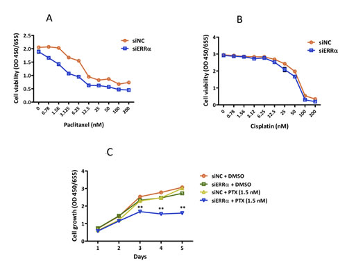 Figure 4: Effect of ERRα knockdown on the sensitivity of endometrial cancer cells to anti-cancer drugs. A. and B., Sensitivity to anti-cancer drugs using WST-8 assay. Twenty-four hours after siRNA transfection, cells were treated with DMSO alone (control), paclitaxel A., or cisplatin B. at the indicated concentrations. After 48 h, cell viability was determined using WST-8 assay. Data represent means ± SEM (n = 4). C., Time course analysis of the sensitization effects with 1.5 nM of paclitaxel. Twenty-four hours after siRNA transfection, cells were treated with DMSO alone or 1.5 nM of paclitaxel. Cell viability was then assessed using WST-8 assay every 24 h. Data represent means ± SEM (n = 4). 4 4Significant differences are indicated as ** for P < 0.01 and * for P < 0.05. Each assay was repeated at least three times. siNC, negative control siRNA; siERRα, ERRα siRNA.