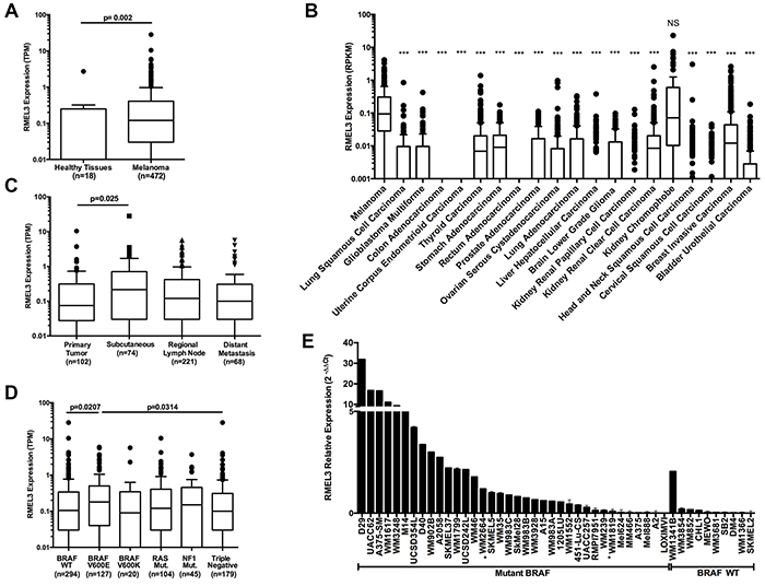 We analyzed the publicly available melanoma TCGA data to identify significant clinical and molecular associations of RMEL3 expression. Analysis of RNA expression data from 472 TCGA melanomas, 16 normal tissues (from Illumina Body Map Project) and 2 melanocytes (GSE38495) [8] confirmed significantly increased expression of RMEL3 in the tumors (Figure 1A). Also, RMEL3 expression is significantly greater in melanoma than a diversity of other tumors (Figure 1B). In clinical samples representing melanoma progression [primary tumors (n=102), subcutaneous tumors (regional cutaneous and in-transit metastasis, n=74), regional lymph node (n=221) and distant metastasis (n=68)], RMEL3 expression was increased in subcutaneous tumors compared to primary tumors (Figure 1C). RMEL3 expression was also significantly increased in melanomas with a BRAFV600E mutation compared to those with a wild type BRAF or triple wild type for BRAF/RAS/NF1 [9] (Figure 1D), an association also observed in a panel of human melanoma cell lines (Figure 1E).