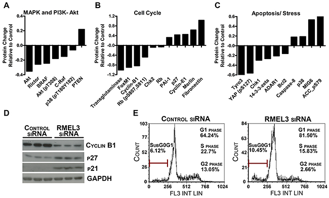 Figure 4: RMEL3 knockdown modulates important melanoma protein levels. A, B, C. Protein relative concentration alteration assessed by RPPA in A375-SM RMEL3-silenced cells involved in the MAPK/ PI3K-Akt pathways, cell cycle and apoptosis. D. Western blot confirmation of important cell cycle regulatory proteins of A375-SM RMEL3-silenced cells. E. Cell cycle analysis of A375-SM RMEL3-silenced cells using propidium iodide as DNA stain.