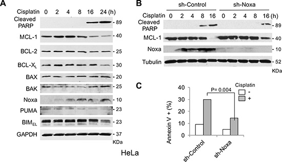 It has been demonstrated that treatment with DNA-damaging agents such as cisplatin induces Noxa expression and apoptosis in a variety of cell lines [9, 10]. Thus, to explore the significance of the Noxa-MCL-1 axis in cisplatin-induced cell death, we first determined the expression of the BCL-2 family proteins in cisplatin-treated HeLa cells (Figure 1A). PARP cleavage indicative of caspase activation and apoptosis was detected after 16 hours, while Noxa induction started 2 hours after the treatment and continued to increase to 24 hours. The level of MCL-1 started to decrease 8 hours prior to PARP cleavage and continued to decrease to 16–24 hours. In contrast, other BCL-2 family proteins were minimally affected by cisplatin treatment. The expression of both BIM and BCL-XL was reduced at 24 hours when massive apoptosis was already observed. These results suggest that Noxa and MCL-1 may contribute to cisplatin-induced apoptosis.