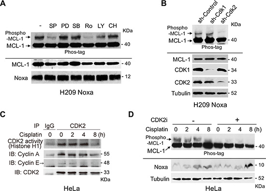 Figure 3: Noxa-induced MCL-1 phosphorylation is regulated by CDK2. (A) Flag-tagged human Noxa was expressed in Noxa-null H209 SCLC cells. Cells were treated with the indicated kinase inhibitors for 4 hours and phosphorylated MCL-1 was detected on SDS-PAGE with Phos-tag. SP: SP600125 (10 μM), PD: PD184352 (5 μM), SB: SB203580 (2 μM), Ro: Roscovitine (50 μM), LY: LY294002 (10 μM), CH: CHIR99021 (5 μM). (B) Lentivirus-mediated shRNA, as indicated, was introduced in the cells and phosphorylated MCL-1 was detected on SDS-PAGE with Phos-tag. (C) HeLa cells were treated with cisplatin for the indicated periods. Equal amounts of total extracts were immunoprecipitated with anti-CDK2 antibodies and CDK2 activities were measured by in vitro kinase assays with histone H1 as substrate. (D) HeLa cells were pretreated with Cdk2 inhibitor II for 30 min, and then treated with cisplatin for the indicated periods. Equal amounts of total extracts were subjected to immunoblot analysis using the indicated antibodies.