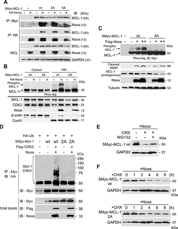 Figure 5: Ser64 and Thr70 contribute to the stability of MCL-1. (A) Myc-tagged human MCL-1 wt, the 2A mutant in which both Ser64 and Thr70 were substituted to Ala, or the 6A mutant in which all potential phosphorylation sites of Ser and Thr were substituted to Ala were co-transfected with Noxa in 293T cells for 24 h. The interaction between Noxa and MCL-1 was determined with co-immunoprecipitation followed by immunoblot analyses with the indicated antibodies. (B) The cells in A were fractionated into cytosol and heavy membrane (HM) fractions. Each fraction was subjected to immunoblot analysis using the indicated antibodies. (C) Myc-tagged human MCL-1 wt or the 2A mutant was stably expressed in HeLa cells. Flag-tagged human Noxa was transiently expressed for 24 h and total extracts were subjected to immunoblot analysis using the indicated antibodies. (D) HA-tagged ubiquitin, Myc-tagged MCL-1, Flag-tagged CDK2, and Noxa were transfected into HeLa cells for 24 h. Total extracts were immunoprecipitated with anti-Myc antibodies followed by immunoblotting with anti-HA antibodies to detect the ubiqutination of MCL-1. The asterisk (*) indicates the position of IgG heavy chain produced by immunoprecipitation. (E) Flag-tagged human Noxa was transiently expressed in the cells in C for 24 h. Then the cells were treated with cycloheximide (CHX, 10 μg/ml) for 6 h with or without MG-132 (10 μM) for 4 h before harvesting the cells. Equal amounts of total extracts were subjected to immunoblot analysis using the indicated antibodies. (F) Flag-tagged human Noxa was transiently expressed in the cells in C for 24 h. Then the cells were treated with cycloheximide (CHX, 10 μg/ml) for the indicated times. Equal amounts of total extracts were subjected to immunoblot analysis using the indicated antibodies.