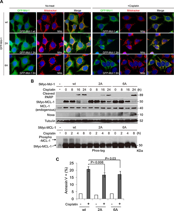 Noxa expression was capable of inducing apoptosis dependent on the MCL-1 phosphorylation status. We further explored whether the phosphorylation-site mutants of MCL-1 could inhibit cisplatin-induced apoptosis. HeLa cells that stably expressed GFP- or Myc-tagged MCL-1-wt, MCL-1-2A, or MCL-1-6A were treated with cisplatin. Co-localization of GFP-tagged MCL-1-wt and mutants with MitoTracker Red was significantly increased after cisplatin treatment (Figure 6A), indicating translocation of MCL-1 from cytosol to the mitochondria regardless of its phosphorylation status. However, MCL-1 phosphorylation induced by cisplatin was inhibited and as a consequence Myc-tagged MCL-1 degradation was delayed (particularly noticeable at 16 hours) in both MCL-1-2A and MCL-1-6A mutants (Figure 6B). Furthermore, cisplatin-induced apoptosis was also reduced in cells expressing MCL-1-2A or MCL-1-6A mutants (Figure 6C). Taken together, cisplatin-induced MCL-1 phosphorylation affects its stability and, as a consequence, apoptosis.