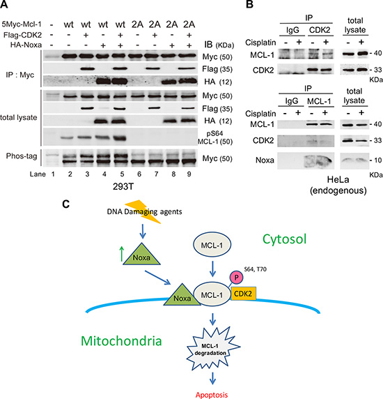 Figure 7: CDK2 binds to and phosphorylates MCL-1, which is enhanced by Noxa expression. (A) HA-tagged Noxa, Myc-tagged MCL-1 (wt or 2A), and/or Flag-tagged CDK2 were transfected into 293T cells for 24 h. Total extracts were immunoprecipitated with anti-Myc antibodies followed by immunoblotting with the indicated antibodies to detect the molecular interactions. Phosphorylation of MCL-1 was detected with phospho-Ser64 specific antibodies or on SDS-PAGE with Phos-tag. (B) HeLa cells were treated with cisplatin for 4 h. Total extracts were immunoprecipitated with anti-CDK2 or anti-MCL-1 antibodies followed by immunoblotting with the indicated antibodies to detect the molecular interactions. (C) Regulation of apoptosis induced by DNA damaging agents through Noxa/MCL-1 CDK2 complex. Details are in the text.