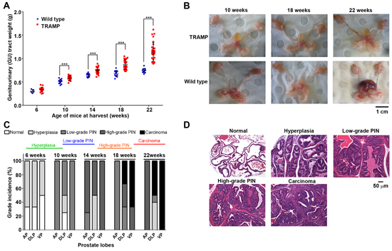 Figure 1: Prostate cancer develops uniformly in the TRAMP mouse model. A. Progressive cancer burden in TRAMP mice monitored by the cumulative weight of the genitourinary (GU) tract (includes prostate, seminal vesicles, testicles and empty urinary bladder). GU tracts were weighed from both wild type and TRAMP mice at the indicated ages (6-22 weeks) and normalised to respective mouse body weights (n=5-15 at each age). Horizontal black lines represent the mean GU tract weight at the indicated age. B. Representative photographs of harvested GU tracts from wild type and TRAMP mice at 10, 18 and 22 weeks of age. C. Histological examination of prostate lobes [anterior prostate (AP), dorsolateral prostate (DLP) and ventral prostate (VP)] with hematoxylin and eosin (H&E) staining, verifying disease grade in TRAMP mice at the indicated ages (6-22 weeks) (n=5 at each age). The most advanced proliferative lesion in each lobe signified the grade of disease. D. Representative H&E-stained sections displaying grades of prostate disease in TRAMP mice from hyperplasia, low-grade PIN, high-grade PIN, adenocarcinoma and invasive adenocarcinoma. H&E-stained normal prostate was obtained from wild type mice. (***p < 0.001).