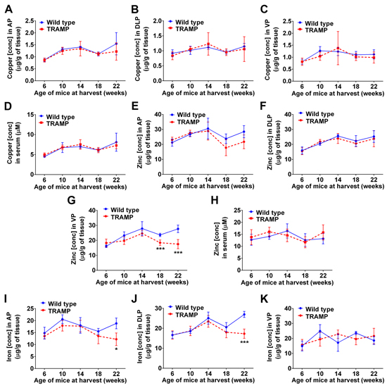 Figure 2: Metal levels in prostate tissue and serum during cancer development in TRAMP mice. Inductively coupled plasma mass spectrometry (ICP-MS) was used to determine whether copper, zinc or iron concentrations change in prostate lobes and sera of TRAMP mice throughout disease progression. A-D. Copper concentrations in anterior prostate (AP), dorso-lateral prostate (DLP), ventral prostate (VP) and serum from both wild type and TRAMP mice at the indicated ages (6-22 weeks). Zinc E-H. and iron I-K. concentrations are also shown. Results represent mean ± STDEV (bar) and are shown as either μg/g wet weight for tissues (n=5-10 at each age) or μM for serum (n=10-17 at each age). (*p < 0.05; ***p < 0.001).