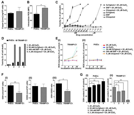 Figure 3: Copper-ionophores generate intracellular ROS and selectively target TRAMP adenocarcinoma cells through a disparity in their antioxidant capacity. A. TRAMP adenocarcinoma cells (TRAMP-C1) have normal intracellular copper levels. Total intracellular copper was measured in both TRAMP-C1 and mouse primary prostate epithelial cells (PrECs) cultured under basal conditions. Results are shown as copper (ng) per 106 cells. B. TRAMP adenocarcinoma cells (TRAMP-C1) have elevated intracellular ROS levels. Intracellular ROS was measured using the cell permeable fluorogenic probe H2DCF-DA and flow cytometry. Results represent mean fluorescence intensity (MFI) (geometric mean). C. Copper-ionophores potently kill TRAMP adenocarcinoma cells (TRAMP-C1). TRAMP-C1 cells were treated for 18 hours with CuII(gtsm), disulfiram (DSF) or clioquinol alone or in combination with 20 μM CuCl2. Ionophore concentrations are shown and cell viability was determined by the propidium iodide exclusion assay and flow cytometry. D. Copper-ionophores selectively kill TRAMP adenocarcinoma cells while not affecting the viability of mouse primary prostate epithelial cells (PrECs). Both cell lines were treated for 18 hours with CuII(gtsm), disulfiram or clioquinol in combination with 20 μM CuCl2. Ionophore concentrations are shown and cell viability was determined by the propidium iodide exclusion assay and flow cytometry. E. Copper-ionophores generate intracellular ROS in TRAMP adenocarcinoma cells (TRAMP-C1) (i), but not in mouse primary prostate epithelial cells (PrECs) (ii). Both cell lines were treated for 2, 4, 6 or 18 hours with CuII(gtsm), disulfiram or clioquinol in combination with 20 μM CuCl2. Ionophore concentrations are shown and intracellular ROS was measured using the cell permeable fluorogenic probe H2DCF-DA and flow cytometry. Results represent mean fluorescence intensity (MFI) (geometric mean) F. TRAMP adenocarcinoma cells (TRAMP-C1) have markedly reduced antioxidant capacity. Reduced (GSH) (i) and oxidised (GSSG) (ii) glutathione were measured in TRAMP adenocarcinoma cells (TRAMP-C1) and mouse primary prostate epithelial cells (PrECs) by HPLC. (iii) The GSH:GSSG ratio is compared between both cell lines. G. Differential GSH expression in TRAMP adenocarcinoma cells (TRAMP-C1) treated with copper-ionophores. Reduced glutathione (GSH) was measured in mouse primary prostate epithelial cells (PrECs) (i) and TRAMP adenocarcinoma cells (TRAMP-C1) (ii) following treatment for 18 hours with sublethal concentrations of CuII(gtsm) (20 nM), disulfiram (150 nM) or clioquinol (2 μM) (with 20 μM CuCl2). Glutathione (GSH & GSSG) was measured by HPLC. Results represent mean ± STDEV (bar) of triplicate determinations for each measurement. (*p < 0.05; **p < 0.01).