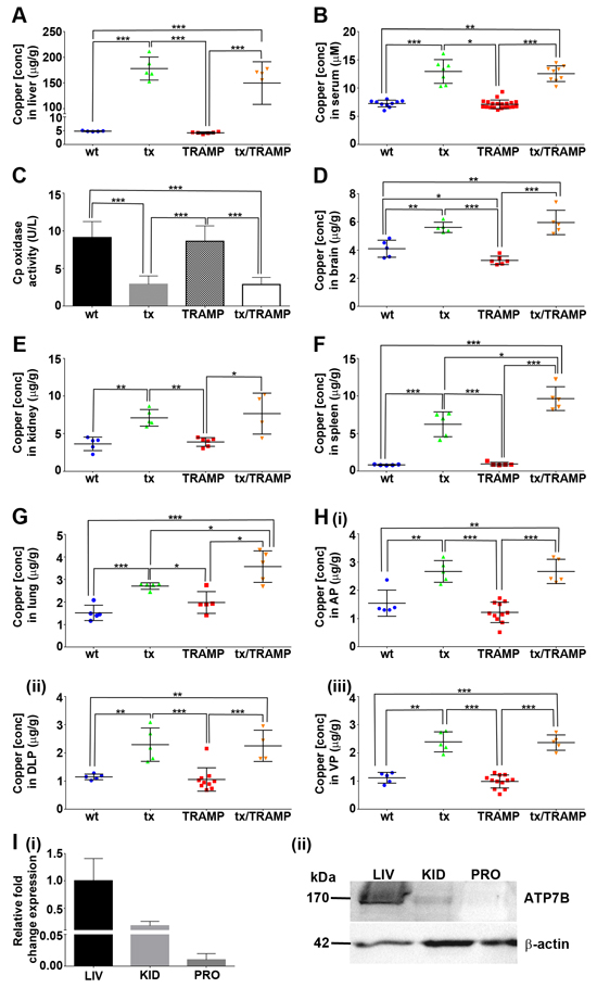 The original tx mouse was on the inbred DL strain [44, 45, 47, 48], while the tx mice used in this study had been backcrossed to the C57BL/6 background for 10 generations. Therefore, we first verified that our tx C57BL/6 model retained the same characteristics (Figure 4). Consistently, tx C57BL/6 mice (22-weeks old) accumulated substantial levels of hepatic copper (~35-fold increase) (Figure 4A) and had elevated serum copper content (~1.8-fold increase) (Figure 4B) [44, 47, 48]. Likewise, TRAMP mice harbouring the tx mutation (22-weeks old) had equivalent copper manifestations (Figure 4A & 4B). To substantiate that copper integration into serum components was also perturbed due to the tx mutation, we measured ceruloplasmin (CP) oxidase activity (Figure 4C). Ceruloplasmin coordinates 6 atoms of allosteric copper that are supplied during its biosynthesis by Atp7b (in hepatocytes) and accounts for more than 70% of the copper found in blood (serum) [9]. Consistent with the lack of fully functional Atp7b, mice harbouring the tx mutation (tx and tx/TRAMP) had significantly reduced serum ceruloplasmin oxidase activity, as measured with the conventional o-dianisidine dihydrochloride substrate (Figure 4C). A further feature of tx mice is copper dyshomeostasis in extrahepatic tissues [47, 48], presumably due to the altered serum copper content. Elevated copper was found to occur in all extrahepatic tissues examined, even those that are not believed to express Atp7b [47, 48]. We confirmed that mice harbouring the tx mutation (tx and tx/TRAMP) have elevated copper in their brain (1.3 to 1.8-fold increase) (Figure 4D), kidneys (2-fold increase) (Figure 4E) and spleen (7.5 to 12-fold increase) (Figure 4F) and further established the same dyshomeostasis in lungs (1.4 to 2.2-fold increase) (Figure 4G) and the prostate lobes (1.8 to 2.4-fold increase) (Figure 4H[i-iii]). Importantly, we demonstrated that normal prostate (wtC57BL/6), analogous to most extrahepatic tissues, does not express Atp7b at the mRNA (Figure 4I[i]) or protein level (Figure 4I[ii]), reducing the possibility of a direct influence of the tx mutation on prostate cancer growth. Therefore, together these results demonstrate that the tx mutation significantly alters systemic copper distribution, providing a unique model to explore the importance of copper in prostate cancer development and progression.