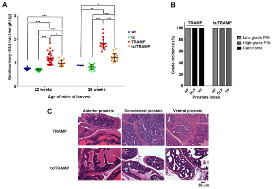 Figure 5: Altered systemic copper distribution impedes prostate cancer growth in TRAMP mice. A. The tx mutation significantly reduces prostate cancer burden in TRAMP mice. Genitourinary (GU) tracts were weighed from 22-week old and 26-week old wild type, tx, TRAMP and tx/TRAMP mice and normalised to respective mouse body weights (n=5-15 for each strain). The mean ± STDEV (whisker plot) for each strain is shown. B. The tx mutation significantly reduces prostate cancer disease severity (grade) in TRAMP mice. Histological examination of prostate lobes [anterior prostate, dorsolateral prostate and ventral prostate] with hematoxylin and eosin (H&E) staining, establishing disease grade in 26-week old wild type, tx, TRAMP and tx/TRAMP mice (n=5 for each strain). The most advanced proliferative lesion in each lobe signified the grade of disease. C. Representative H&E-stained sections displaying prostate disease grade in the prostate lobes [anterior prostate (AP), dorsolateral prostate (DLP) and ventral prostate (VP)] of 26-week old TRAMP and tx/TRAMP mice. (*p < 0.05; **p < 0.01; ***p < 0.001)