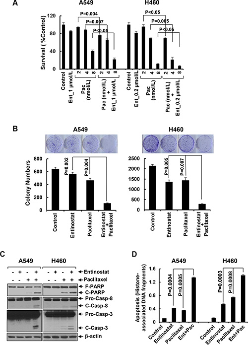 Figure 1: Entinostat significantly enhances paclitaxel-induced growth inhibition and apoptosis in NSCLC cells. (A) A549 and H460 cells were plated onto 96-well plates. After 24 h, the culture media were replaced with fresh media or the same media containing indicated concentrations of either entinostat (Ent) or paclitaxel (Pac) or both entinostat and paclitaxel for another 72 h. The percentages of surviving cells from each cell line relative to controls, defined as 100%, were determined by reduction of MTS. (B) A549 and H460 cells were grown in triplicates in the absence or presence of either entinostat (1 μmol/L for A549 and 0.2 μmol/L for H460) or paclitaxel (4 nmol/L) alone or both entinostat and paclitaxel for 2–3 weeks. The pictures and numbers of the cell colonies were obtained by the QuantiOne software of Fluor-S™ Multimager. (C and D) A549 and H460 cells were treated with either entinostat (3 μmol/L and 0.5 μmol/L for A549 and H460, respectively), or paclitaxel (6 nmol/L and 3 nmol/L for A549 and H460, respectively) alone, or both entinostat and paclitaxel for 24 h. Cells were collected and subjected to western blot analyses of PARP (F-PARP, full length PARP; C-PARP, cleaved PARP), caspase-8 (Pro-Casp-8, pro-caspase-8; C-Casp-8, cleaved caspase-8), caspase-3 (Pro-Casp-3, pro-caspase-3; C-Casp-3, cleaved caspase-3), or β-actin (C), or apoptotic-ELISA (D). Bars, S.D. All data show the representative of three independent experiments.